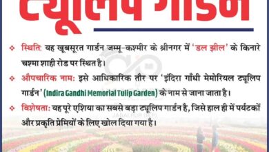 - जम्मू-कश्मीर के श्रीनगर में स्थित एशिया का सबसे बड़ा ट्यूलिप गार्डन