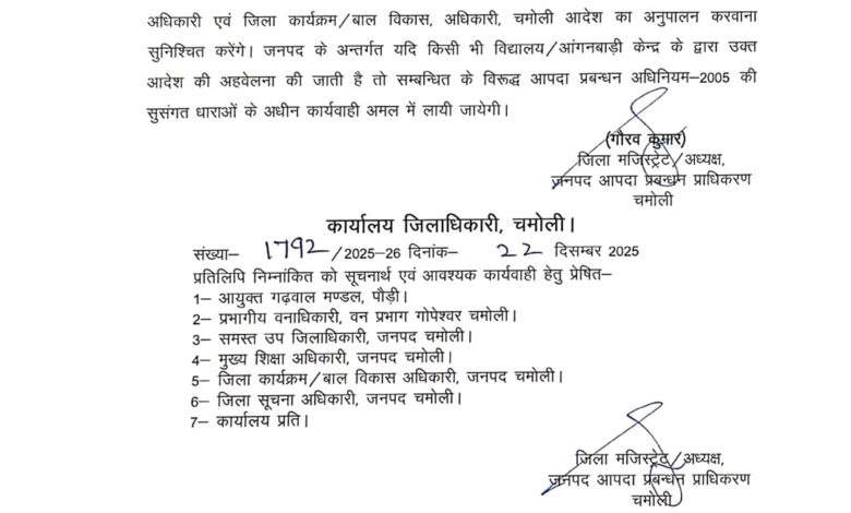 जनपद में वन्य जीवों की बढ़ती सक्रियता एवं मानव–वन्य जीव संघर्ष की संभावित घटनाओं को देखते हुए जिलाधिकारी गौरव कुमार द्वारा सुरक्षा के दृष्टिगत आवश्यक निर्देश जारी किए गए हैं। इसी क्रम में जनपद के समस्त राजकीय, राजकीय सहायता प्राप्त एवं मान्यता प्राप्त निजी विद्यालयों का संचालन प्रातः 10:00 बजे से अपरान्ह 03:00 बजे तक तथा सभी आंगनबाड़ी केन्द्रों का संचालन प्रातः 10:00 बजे से अपरान्ह 01:00 बजे तक किए जाने के आदेश दिए गए हैं।यह आदेश तत्काल प्रभाव से 15 जनवरी 2026 तक लागू रहेगा।