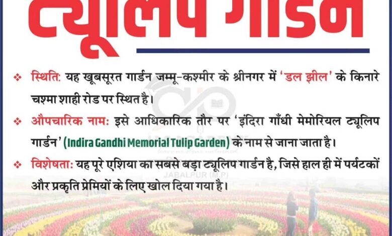 जम्मू-कश्मीर के श्रीनगर में स्थित एशिया का सबसे बड़ा ट्यूलिप गार्डन (इंदिरा गांधी मेमोरियल ट्यूलिप गार्डन) 2026 के सीजन के लिए 16 मार्च 2026 को आधिकारिक तौर पर जनता और पर्यटकों के लिए खोल दिया गया है।